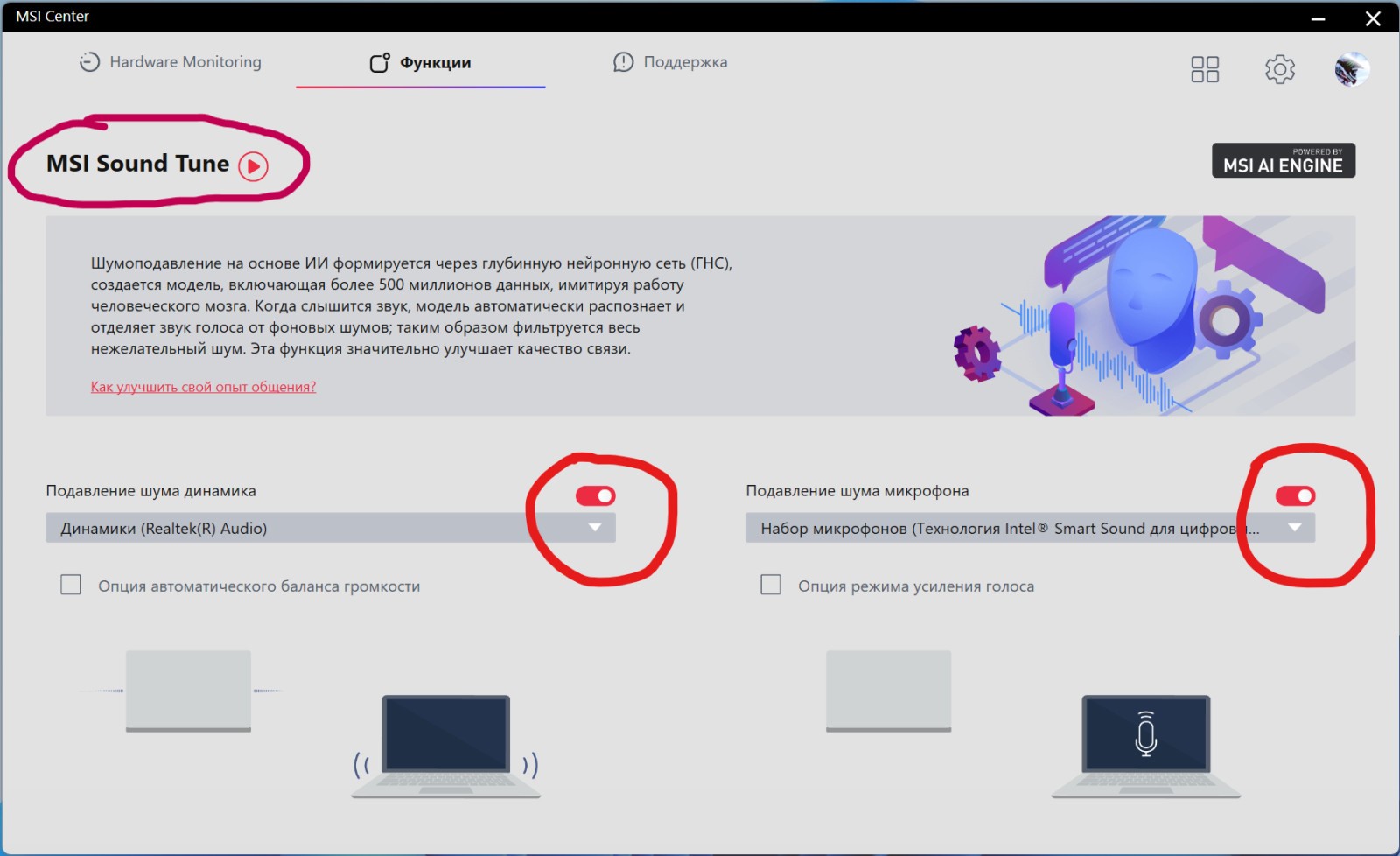 But the following helped me: Open the MSI Center>Feature sets(The upper right corner of MSI Center's page)>Sound Tune>Install this feature and check it again>Set the checkboxes as on the screenshot.